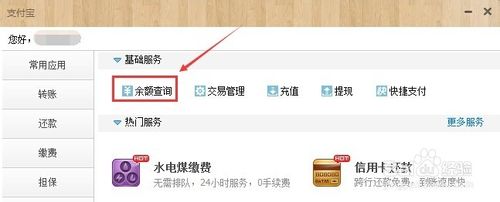 5、点击打开支付宝对话框,在支付宝的基础服务里,我们点击余额查询,如下图所示。