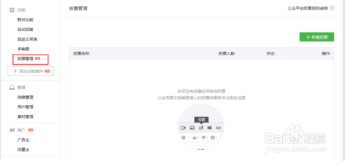 2、点击做的功能按钮下的“投票管理”,跳转到如图界面。