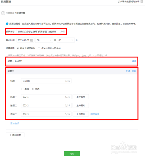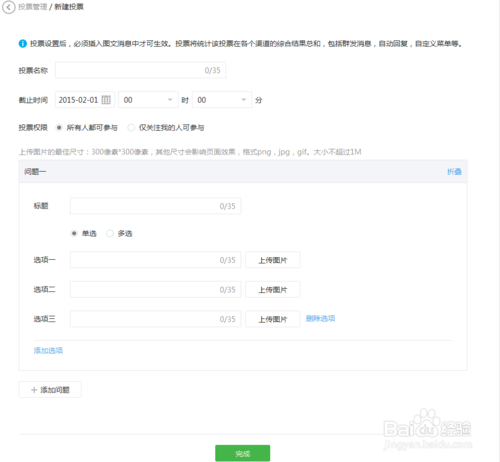 4、在此界面通过填充内容做一个投票设置:第一个选项为带图单选,第二个选项为无图多选,设置成功后点击页面底部“完成”按钮。