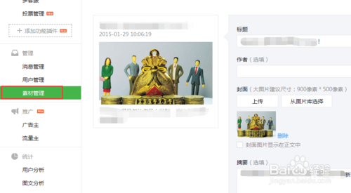 6、找到一篇恰当的图文信息,将此投票到图文素材中:素材管理—>打开一条素材。