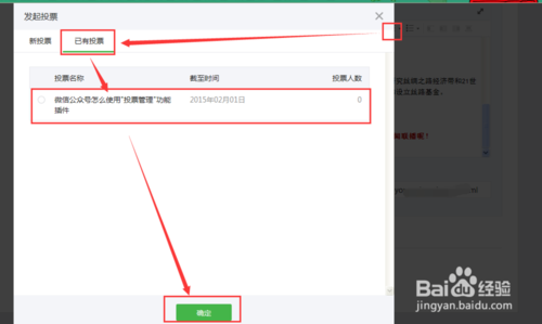 7、将光标定位在在这条素材管理的编辑框内的合适地点(投票的地点),点击编辑框的投票按钮,弹出如图所示界面,选择已经设置好的投票,点击确定并保存此图文资源。