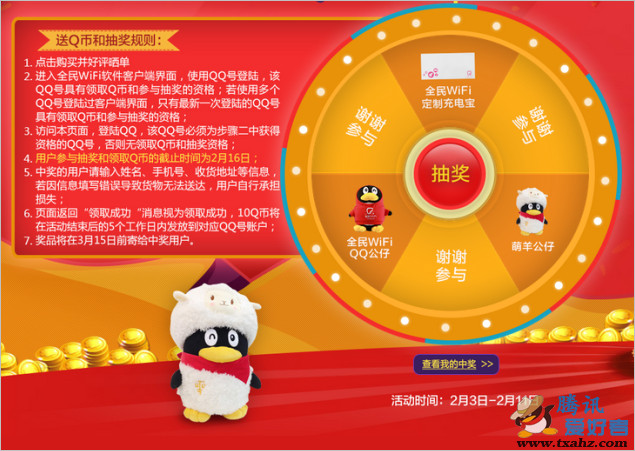 QQ登录全民WIFI,然后打开活动地址直接领取Q币便可。还可以抽奖得实物等!