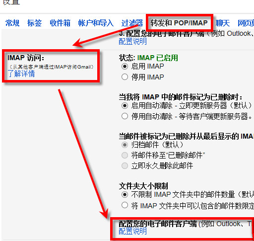 3、POP和IMAP都可以使用,但推荐使用IMAP,所以页面向下拉,找到“IMAP访问”项的末尾,点击“配置说明”