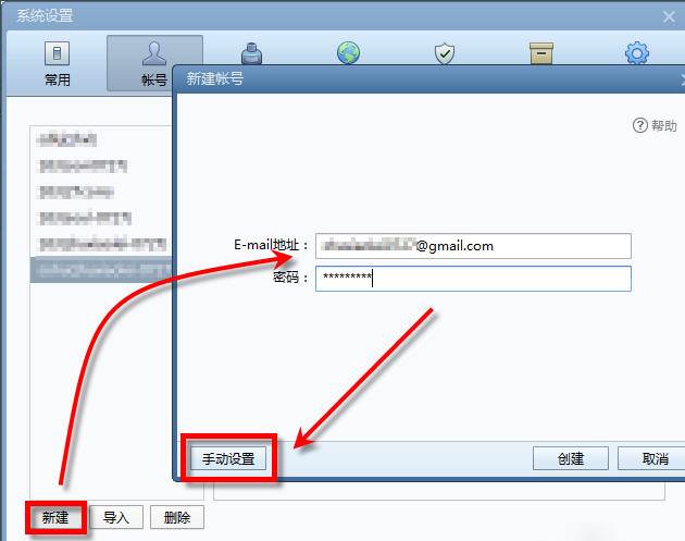 9、在左侧下面点击“新建”,弹出新建账号窗口,填入你的gmail账号和密码。然后点击左下角的“手动设置”。