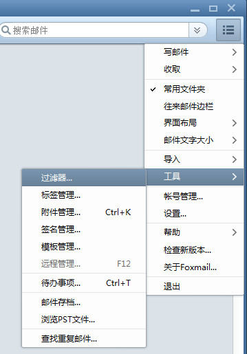 1、打开foxmail的客户端,点击在右上角的菜单图标——》工具——》过滤器