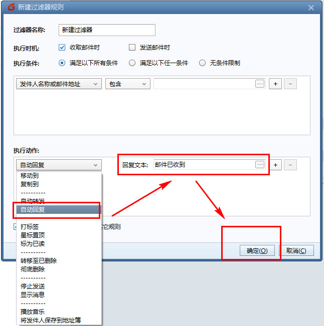 3、接下来,我们就来设置自动回复的过滤器的规则。设置名称,设定自己喜欢的名字就可以。执行时间,一般设定为“收取邮件时”对于执行条件,自动回复,我们一般对所以邮件都进行回复,所以选择最后一项。如果你需要对特定的邮件特定的回复,就可以设置相关的条件,自由组合自定义内容,非常方便。