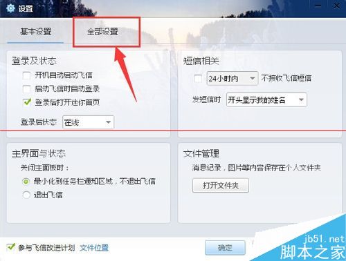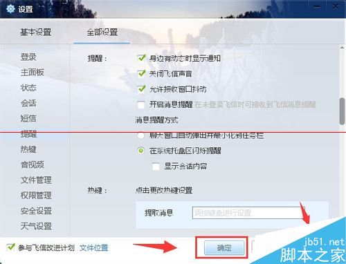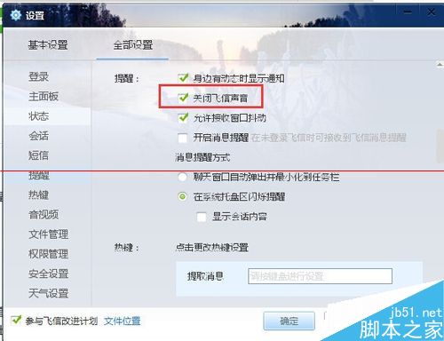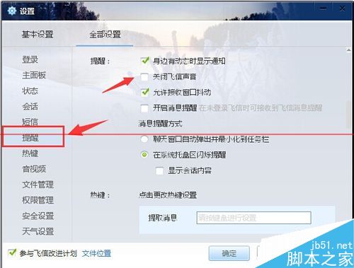 6、来到全部设置的登陆设置页面,再点击左侧列表中的”提醒“菜单,然后就可以看到右侧”关闭飞信声音“前面的方框是空白的,然后用鼠标点击方框进行选中勾上,再点击右下角的”应用“按钮,最后再点击”确定“就可以了。(如下图)