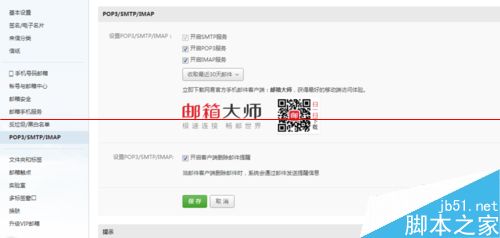注意事项:在第三步中,勾选 “开启POP3服务” 和“开启IMAP服务” 后,一定要单击下面的 “保存”按钮,否则不会弹出输入手机号和验证码的对话框。