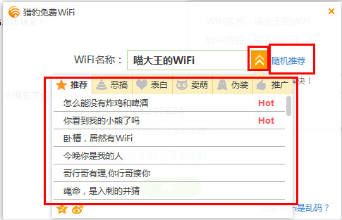3、可以点击wifi名称框旁边的下拉按钮选择你自己喜欢的,也可以点击旁边的随机推荐让电脑为你选出一些热门的