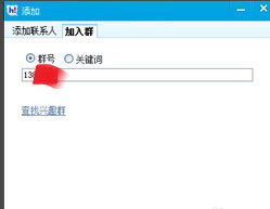 4、接着弹出一个框,在这个框界面上选择加入群选项卡,然后在输入框中输入群号码,如图所示