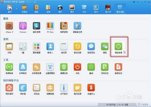 1、首先在同步助手的“更多功能”界面下单击“微信表情”图标按钮进入。