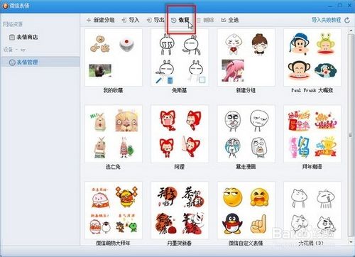 2、在微信表情-表情管理窗口下,单击“恢复”按钮。