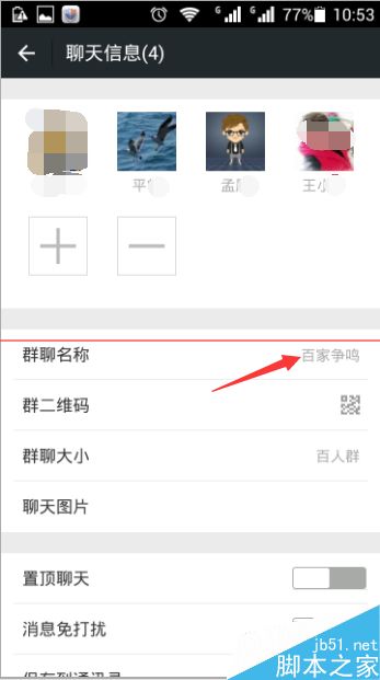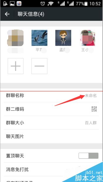 3、点击进入聊天信息以后,该群的成员等基本信息都出现在页面上,点击里面的“群聊名称”菜单,如图所示。