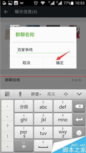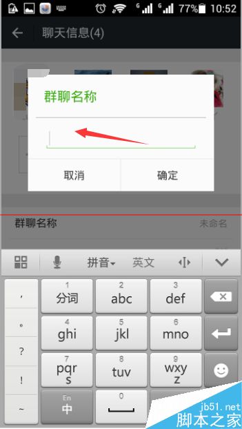 4、点击进入以后,可以看见有个让你输入群聊名称的对话框,输入你想要命名的文字,如图所示。