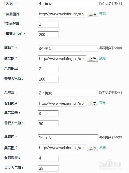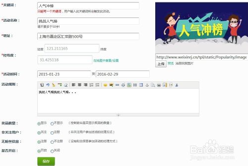 第四步,填写活动设置与奖项设置。注意关键词和经纬度的设置,完了点保存继续下面的填写,温馨提示:推荐每个奖项的人气值最好从小到大进行设置。奖项最多设置4个。单个奖项参数请填写完整,否则前台将不予显示。奖品图片宽高比例请尽量一致