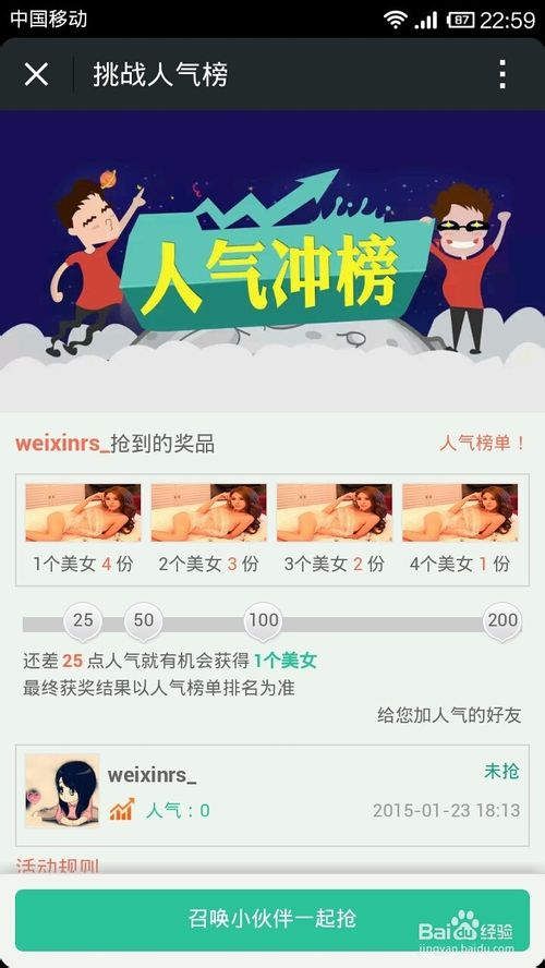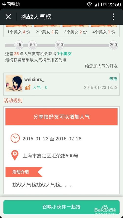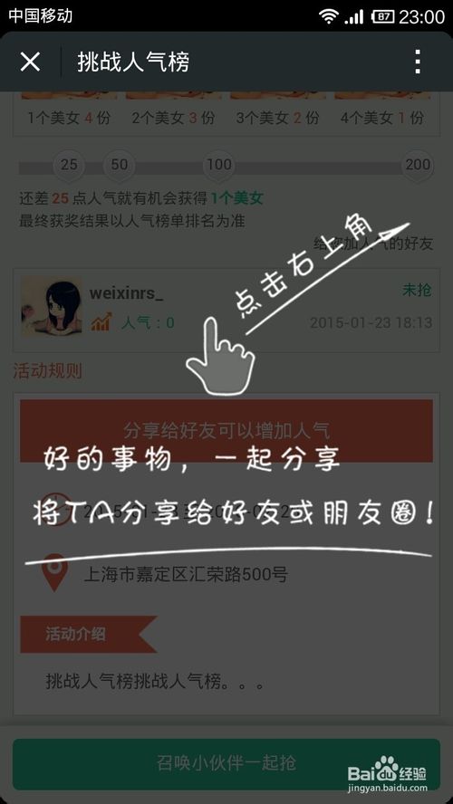 第六步,分享到朋友圈给自己增加人气,在微信人家网站后台点击--人气榜,可以查看当前参与用户的排名。
