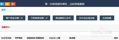 步骤二,进入后台以后先添加公众号,或者可以看一下页面最上方的“第一次使用绑定教程”。