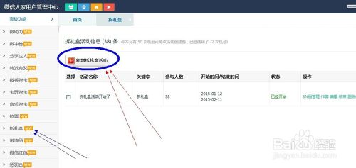 步骤四,点击左边的--高级功能,接着点--拆礼盒,这时就进入到了制作页面。点击【新增拆礼盒活动】功能按钮,进入到填写的地方。