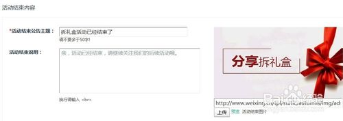 步骤六,填写活动结束内容,包括公“告”主题,封面图片等。