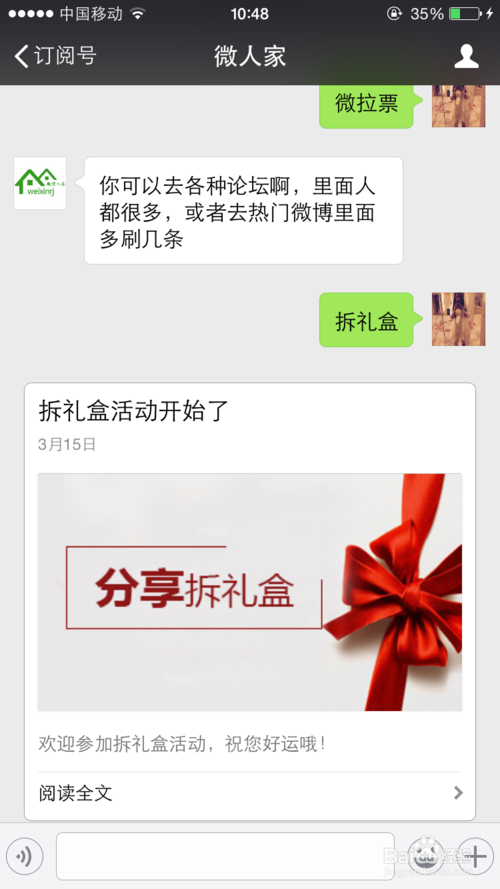 第一步,在手机上打开微信,找到前面绑定的公众号,回复设置好的关键词。