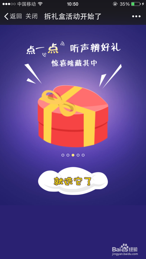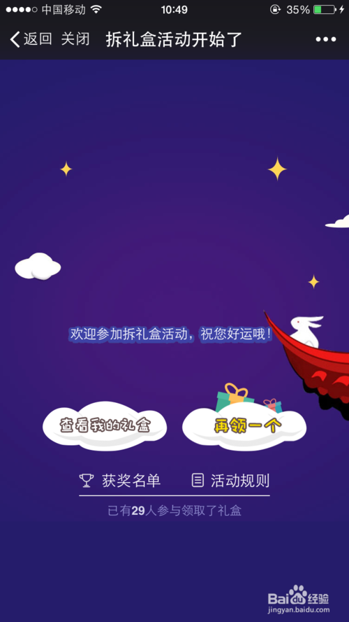 第三步,选好以后,点击【就选它了】,这时就进入了我的“礼”盒界面,可以通过“获”奖“名”单,或者活动“规”则查看当前参与状态。