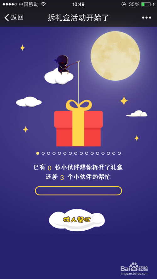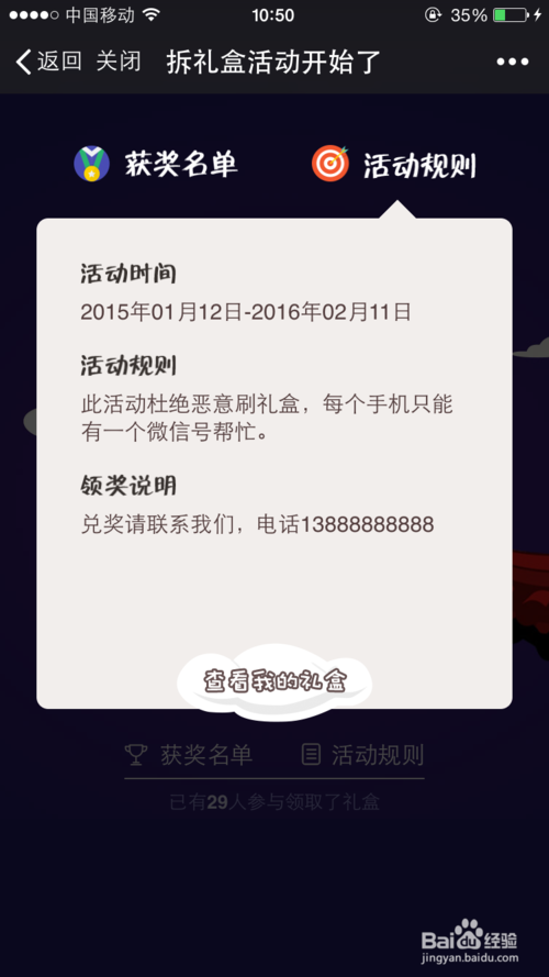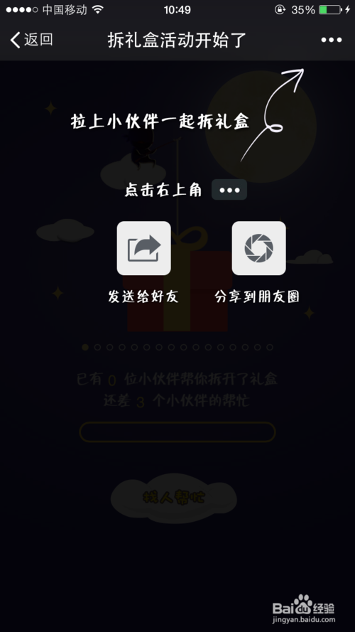 第四步,邀“请”好友来帮忙拆盒子啦,点击会提示右上角的分享,分“享”到朋友圈或者好友,让别人给你点击,达到要求后就可以“领”取商家设置好的礼品了,同时也提“高”了公众平台的曝光量与关注量。