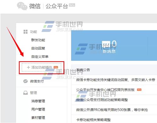 1)微信公众号附近商户申请的入口位于微信公众平台左侧的添加功能插件【+】(加号)栏。(如下图)