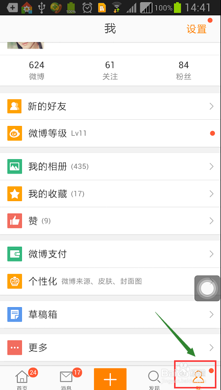 首先,在手机端打开新浪微博这款应用,然后在首页最下方由"首页"切换至"我",如图