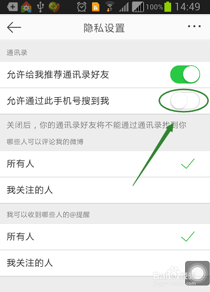 接着点击该项,那么这个功能就会关闭,以后别人即使知道我们的手机号,也是无法查看我们微博内容的
