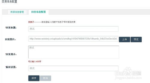 其次,回复信息配置,关键词是设定好的,不需要在填,编辑基础内容保存即可。