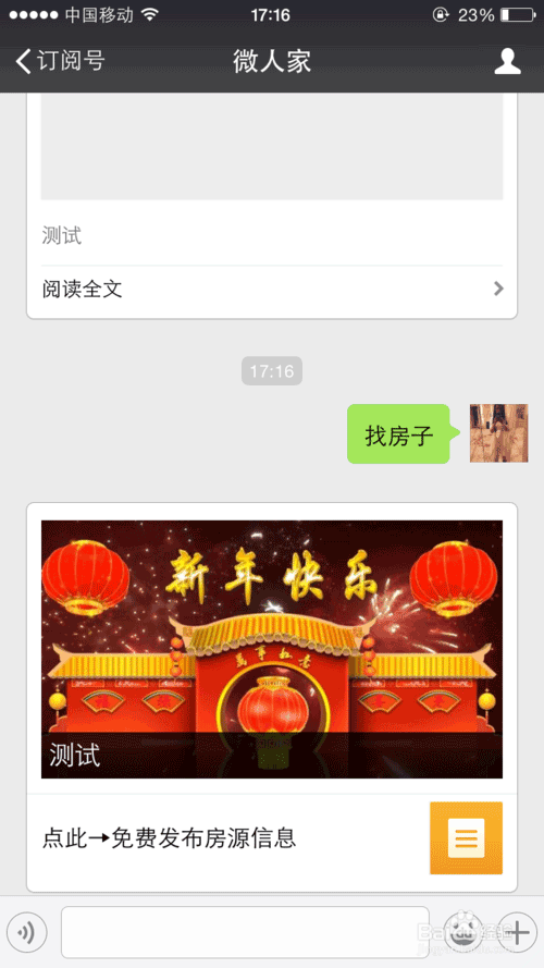 再次,手机回复关键词“找房子”,即会跳出设置好的内容,手机打开内容,即可编辑“房”产"的信息。