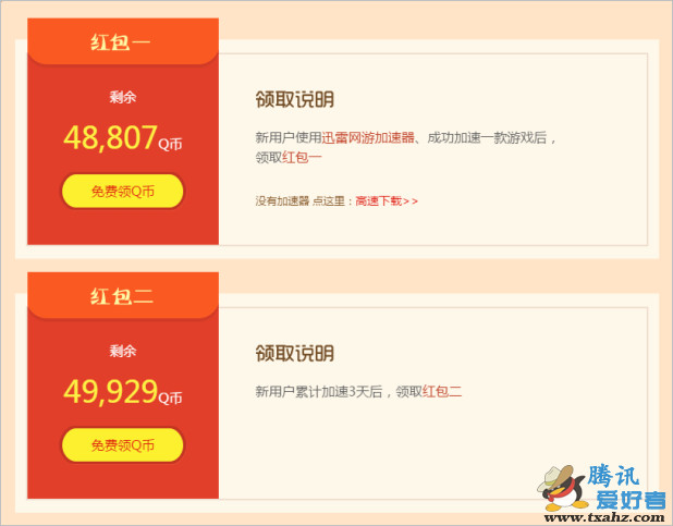 迅雷红包来袭活动,新用户免费体验迅雷网游加速器,成功加速100%领Q币。应该很多人都有迅雷帐号的吧,不过大家可以新注册个迅雷号参与活动。获得的Q币数量是随机的,且数量有限。不过活动说是长期活动,不知道10万Q币发放后是否还有哈!