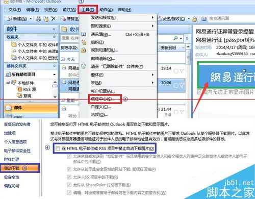 1、如果用的是outlook2007,打开outlook,选择工具-信任中心-自动下载,取消“在html电子邮件式rss项目中禁止自动下载图片”选项,,重新打开outlook即可.