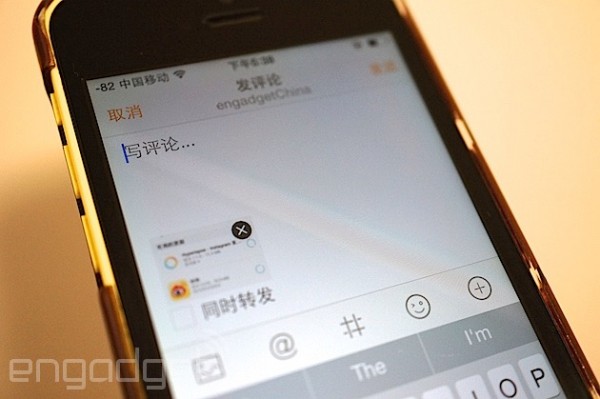 今日,iOS版新浪微博客户端迎来了最新版v5.2.8,除了完善个人主页布局、“随手拍”之外,还意外带来了图片评论功能。升级之后,用户不但可以输入文字、表情、名片,还支持添加本地图片。需要注意的是,图片在PC端显示的还不够完美,只是显示一条链接。