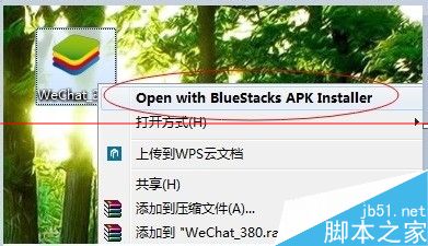4、下载微信app在电脑上,右击选择使用BlueStacks安装。
