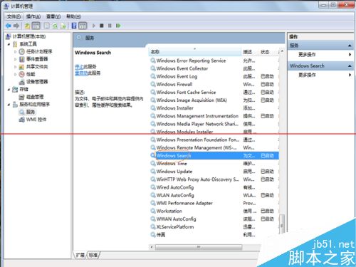 1、当然,要使用索引服务,必须确保电脑上已经安装了索引服务,且索引服务是处于启动状态,可使用右键点击我的电脑,选择管理,在管理计算界面,选择左方的服务与应用程序--服务,在右方查找windows search服务,确保处于启动状态。