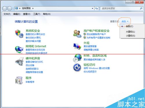 2、选择开始----控制面板,进入控制面板窗口,然后在控制面板窗口选择右上角的<查看方式>,然后在下拉选择中选择大图标,在下图所示红圈位置选择。