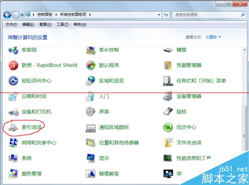 3、控制面板会调整显示方式,出现大量选择,下拉右侧下位条,直到看到<索引选项>选择项,如下图所示,双击进入。