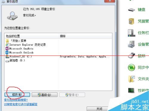4、在后一窗口可以看到目前索引的状态,小编的电脑已经完成了创建,如果还没创建完成,可选择下方的修改按键。