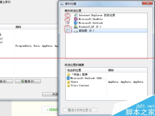 5、去掉除outlook以外的所有项目前的复选框,如下图所标操作,这样确保只创建outlook邮件的索引,而不会忙着创建其它索引,从而提高邮件索引的创建速度。