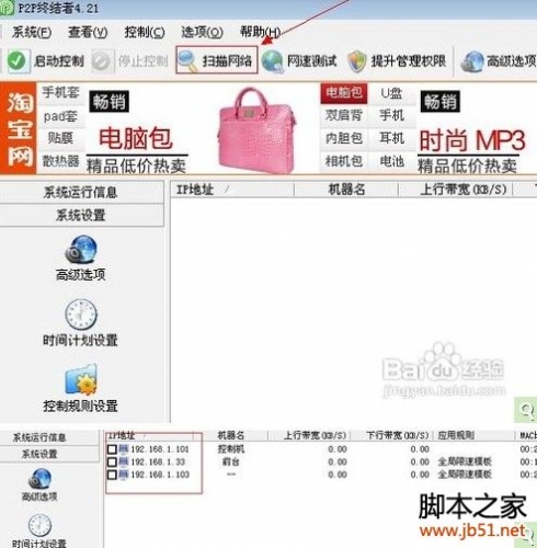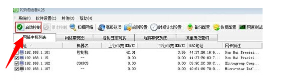 点击主界面中的“扫描网络”,程序就开始扫描局域网中的所有计算机,过会就全部列举出来。然后选择你要控制的计算机,在需要限制网速的计算机名前打“勾”,