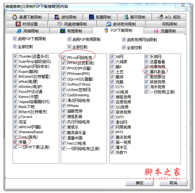 选择“P2P下载限制”,在这里我们可以限制某些下载工具(比如迅雷)的下载速度,凡是被勾选的项都将被应用“全局限模式”,在此,小编根据本局域网的特点将“迅雷”和“PPS”应用全局限速模式,以限速这两者的下载速度。一般来说,经过这两步的设置之后,就基本达到限制网速的目地了,最后点击“确定”完成设置。
