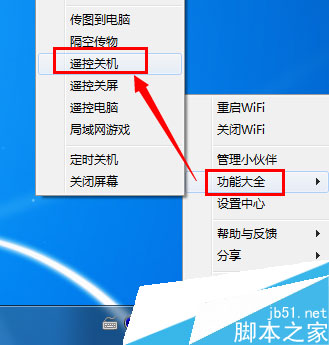 一:打开猎豹免费WiFi程序,右击任务栏,从弹出的扩展菜单中选择“功能大全”->“遥控关机”。