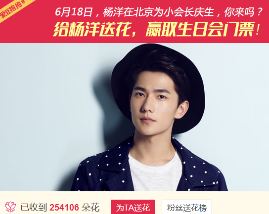 6月8日至14日期间,为杨洋送花有机会获得《爱豆抱抱》微博会员生日会门票;