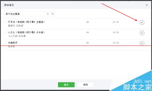 4、查找到想要的歌曲之后,可以从歌曲的右边点击【试听按钮】,试听OK之后,即可点击【 确定 】了
