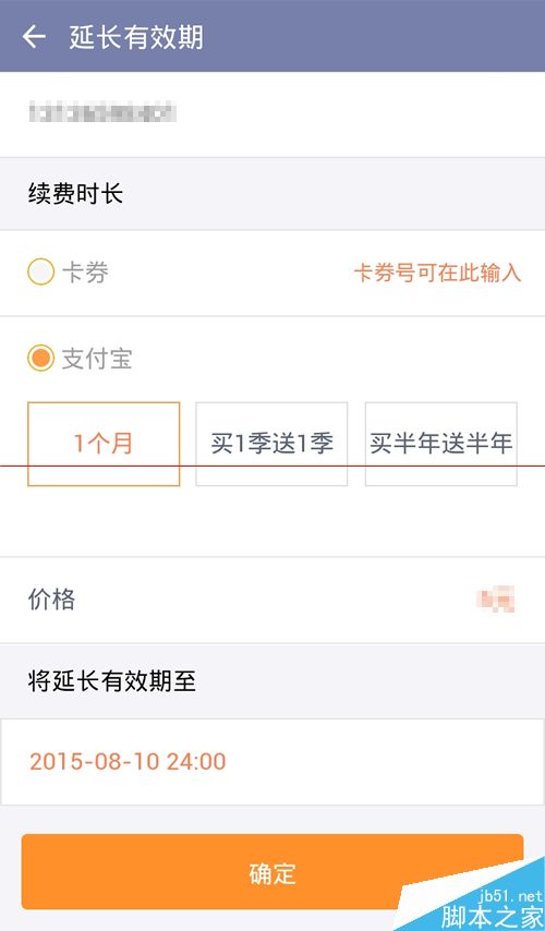 3、选择续期的支付方式,默认为使用支付宝;再点击选择延长有效期的时间,时间越长越有优惠哦,点击【确定】准备付款。
