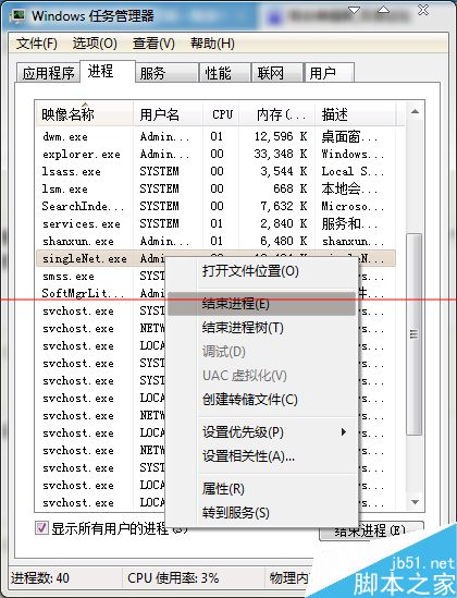 3、在任务管理器中先把“singleNet.exe”关掉,再把"shanxun.exe"关掉。一定要按顺序来。