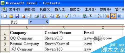 1、准备一个Excel文档Contacts,将里面的一个工作表命名为Contact Info,工作表有 Company,Contat Person和 Email三栏,格式/内容如下: