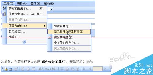 3、将鼠标定位邮件内容区域,然后选择菜单栏的“工具”——“信函与邮件”——“显示邮件合并工具栏”: