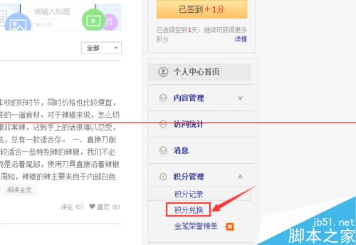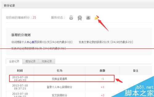 6、之后,在积分兑换记录中就可以看到积分减一,同时你的金笔图标点亮了。